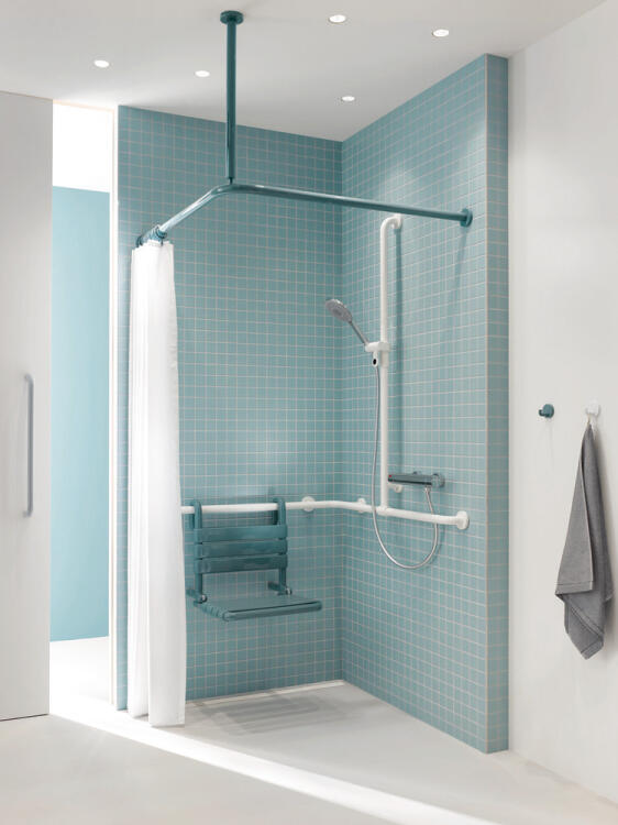 Made of rails, seat and back slats, with continuous, corrosion resistant steel core. 345 mm wide, 471 mm high and 480 mm deep, seat 345 mm wide and 336 mm deep, seat slats 55 mm wide, for hanging in shower grab rails and support rails, rail diameter 33 mm, made of polyamide according to HEWI colour chart