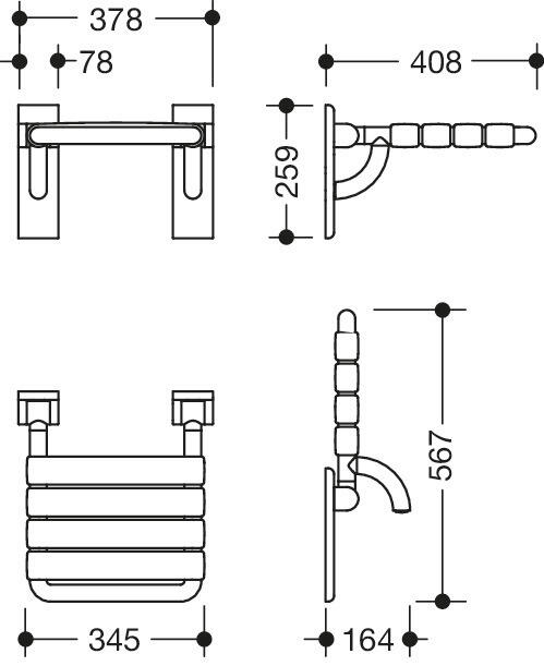Can be folded up. Made of rails and seat slats with continuous, corrosion resistant steel core. Seat slats 55 mm wide. Adjustable seat tilt. Made of high-quality polyamide according to HEWI colour chart. Available in more colours. Mounting on the wall with HEWI wall-specific fixing material made of stainless steel.