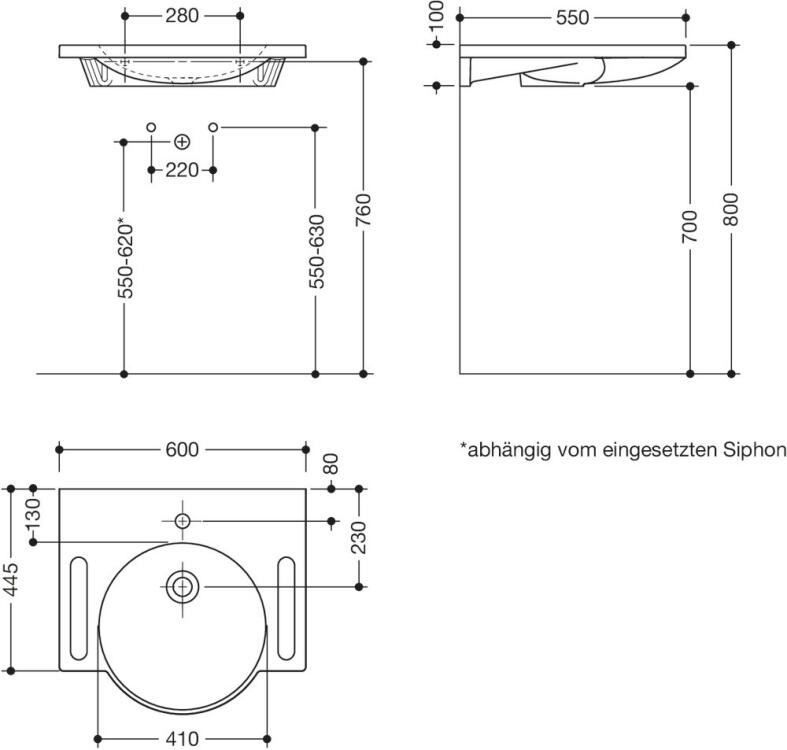 made of mineral composite with non-porous surface, alpine white, with round basin, integrated gripping feature on the side, can be used as a towel holder, without overflow, prepared for single hole mixer tap, wheelchair accessible to DIN 18040 and ÖNORM B1600/1601, weight capacity to EN 14688, 600 mm wide and 550 mm deep, CE and UKCA