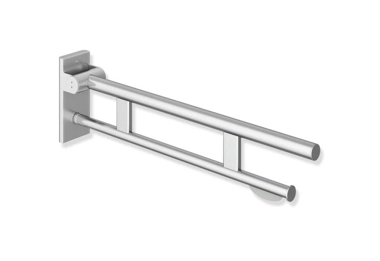 HEWI Duo hinged support rail, stainless steel, satin, w/toilet roll holder, projection 850 mm, 210 mm high and 101 mm wide, dia. of upper rail 33.7 mm, bottom rail 25 mm, weight capacity up to 150 kg,: Produced in accordance with CE- and UKCA-Regulation (EU) 2017/745 on medical devices.Fulfils DIN 18040 requirements, ÖNORM B1600/1601 and SIA 500.