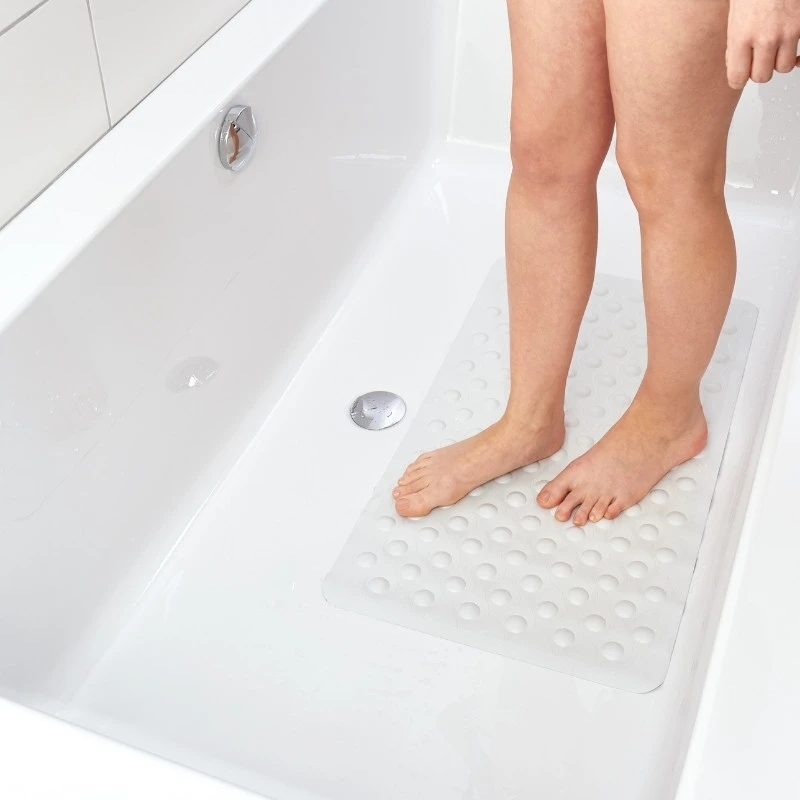 Non-slip bath mat enhances safety in the shower or bath, offering extra protection against slipping; ideal for individuals with reduced balance. Features a non-slip surface and strong suction cups for stability. Easy to clean and fits most shower spaces.