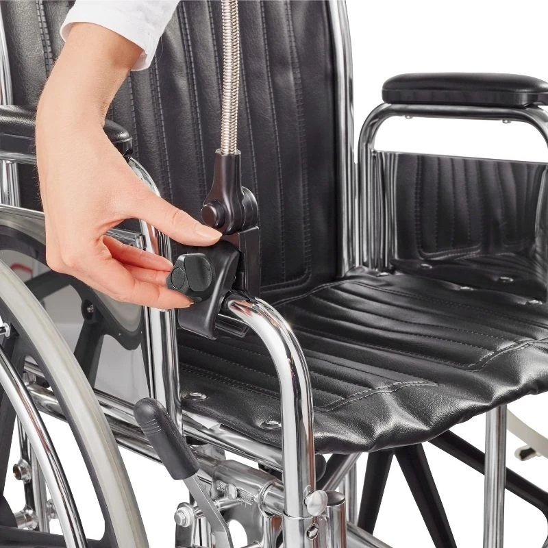 Custom umbrella for wheelchair or rollator. Protects from sun and rain without needing to move. UV coating, reinforced frame, and flexible adjustment ensure comfort. Fits tubes Ø1825 mm. Diameter: 72 cm. Height: 78 cm.