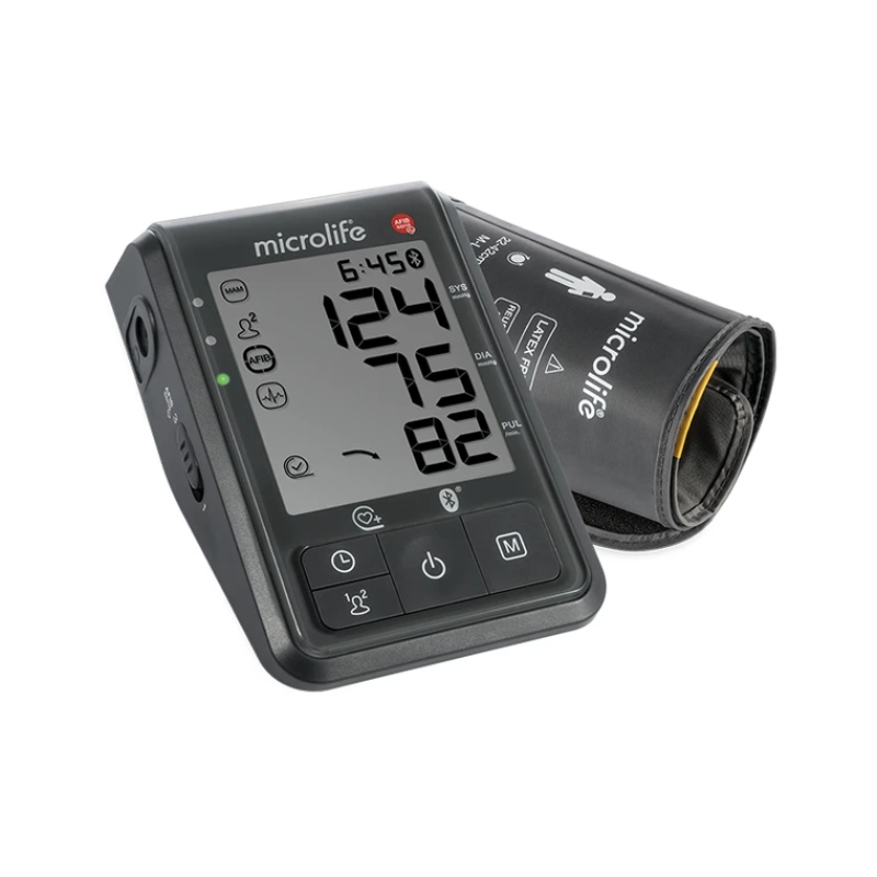 Microlife BP B6 Connect is an advanced upper-arm blood pressure monitor with AFIBsens for atrial fibrillation detection, IHB for arrhythmia, and MAM for 3 accurate readings with one click. Bluetooth sync to app, large display, traffic light indicator, memory for 2 users, and 5-year warranty.