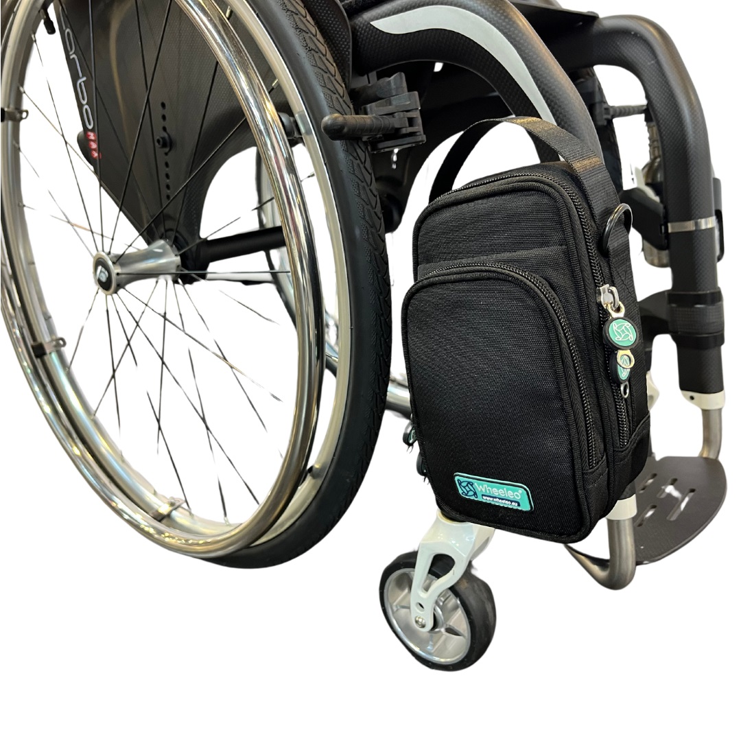 WheeBag is the practical, adjustable bag that clicks securely onto your Wheeleo, wheelchair, or other mobility aids, providing easy access to small personal items such as your phone, keys, or wallet. It is designed to sit discreetly and stably without restricting movement.