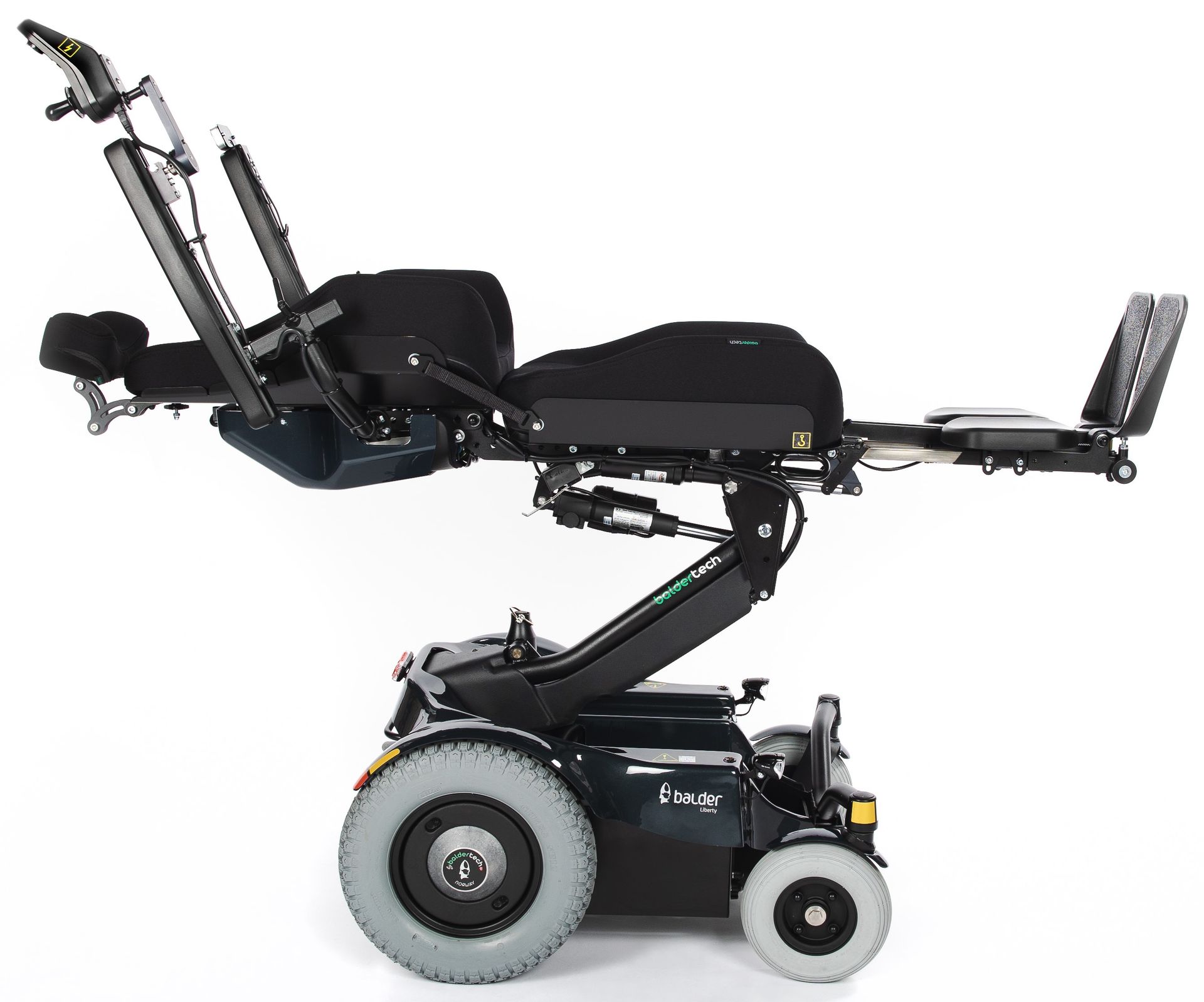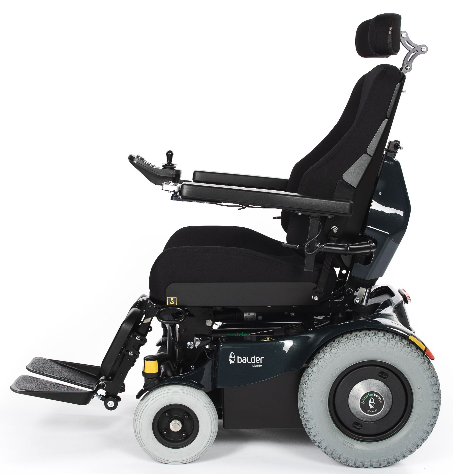 Balder Liberty: Rearwheeldrive power chair with 5 electric seat functions: lift, tilt (15 to 45), recline, and leg support. Offers full recline and variable height for flexible positioning and easier transfers.