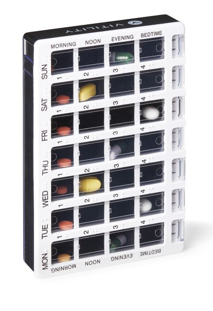 Smart pilleæske med doseringrum til alle ugens 7 dage, med 4 rum pr. dag til inddeling af medicin.