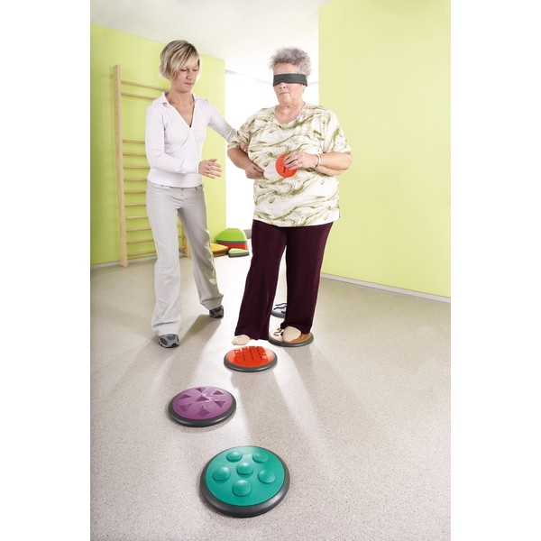 Sæt med farvede sanseskiver til hånd/fod-brug. Leveres med øjenbind og taske. Fås i 3 sæt med 10–20 skiver i forskellig struktur.