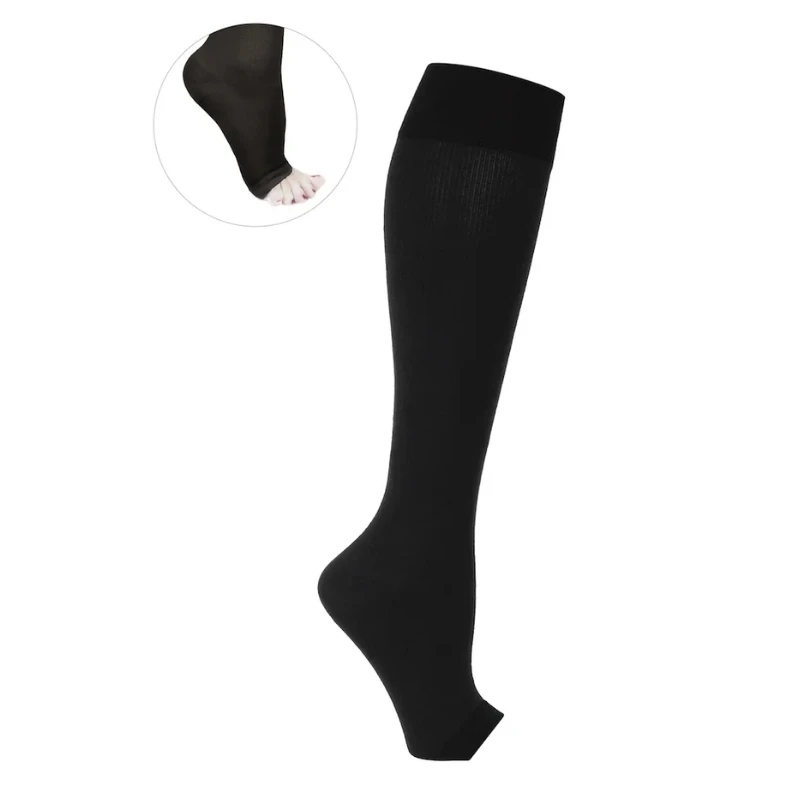 Knælange kompressionsstrømper uden tå i Klasse 2 (23-32 mmHg). Anvendes ved åreknuder, hævede ben, venøse lidelser og postoperativt. Åben tå sikrer ventilation og bevægelsesfrihed. Materiale: antibakterielt Meryl Skinlife med sølvioner. CE-mærket og Oeko-Tex-certificeret.