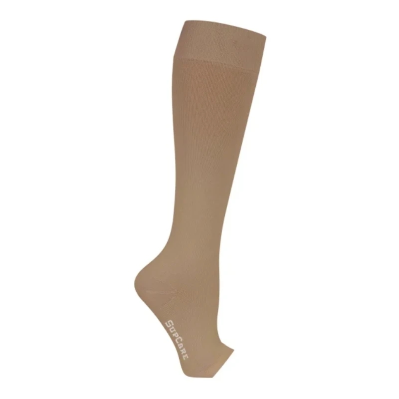 Knælange Klasse 1 støttestrømper uden tå (15-21 mmHg) fra SupCare. Øger blodcirkulation og reducerer hævelse, åreknuder og træthed. Åben tå sikrer ventilation og kan anvendes med sandaler. Materiale: bomuld og elastan. CE-mærket og Oeko-Tex certificeret.
