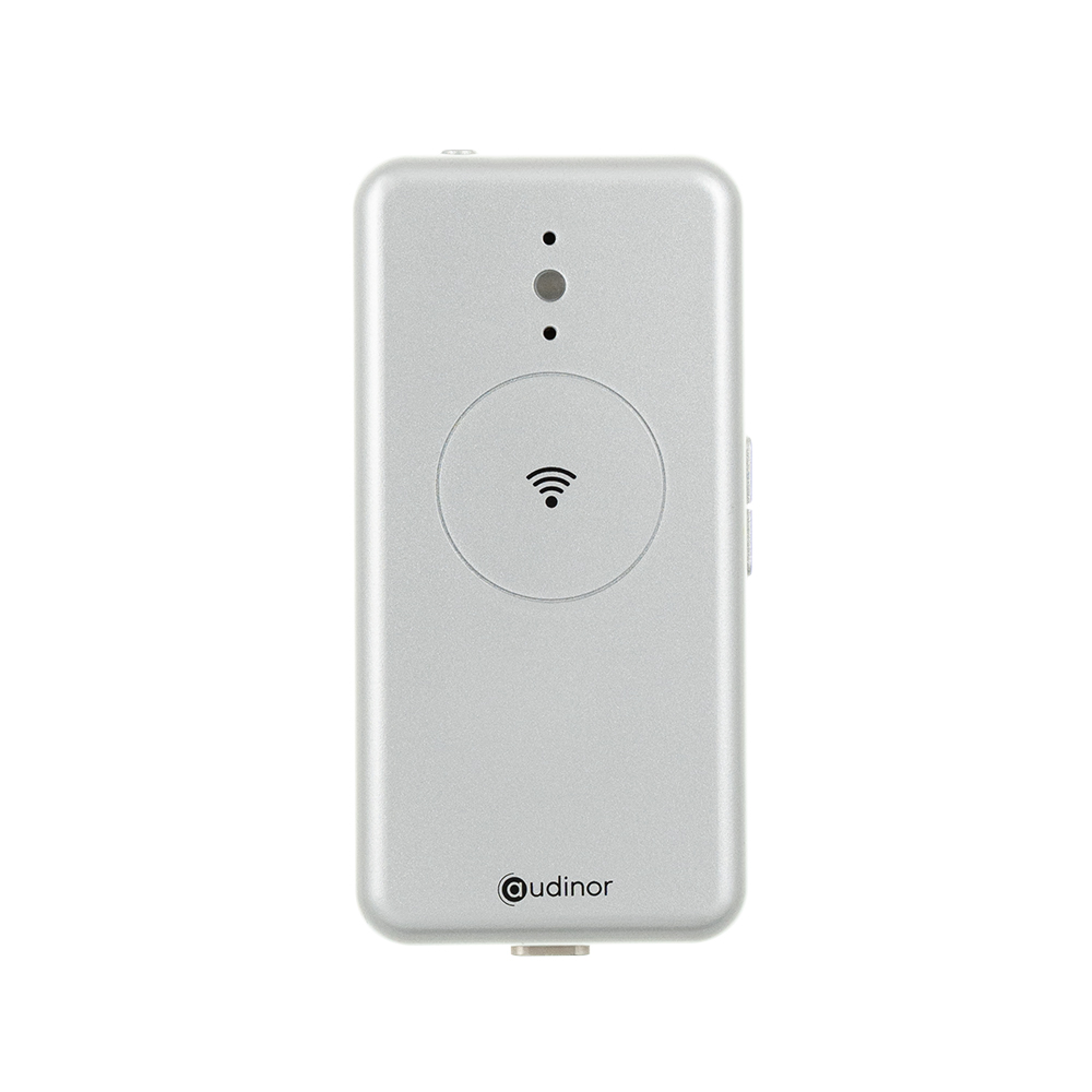 T50 Transmitter 4.0 er en trådløs sender, der tilsluttes en lydkilde som tv. Den sender lyden til høreapparater eller trådløse hovedtelefoner via X40 Transceiver 4.0. Når T50 Transmitter 4.0 registrerer et lydsignal, sender den lyden videre. Den stopper med at sende når lydsignalet forsvinder.