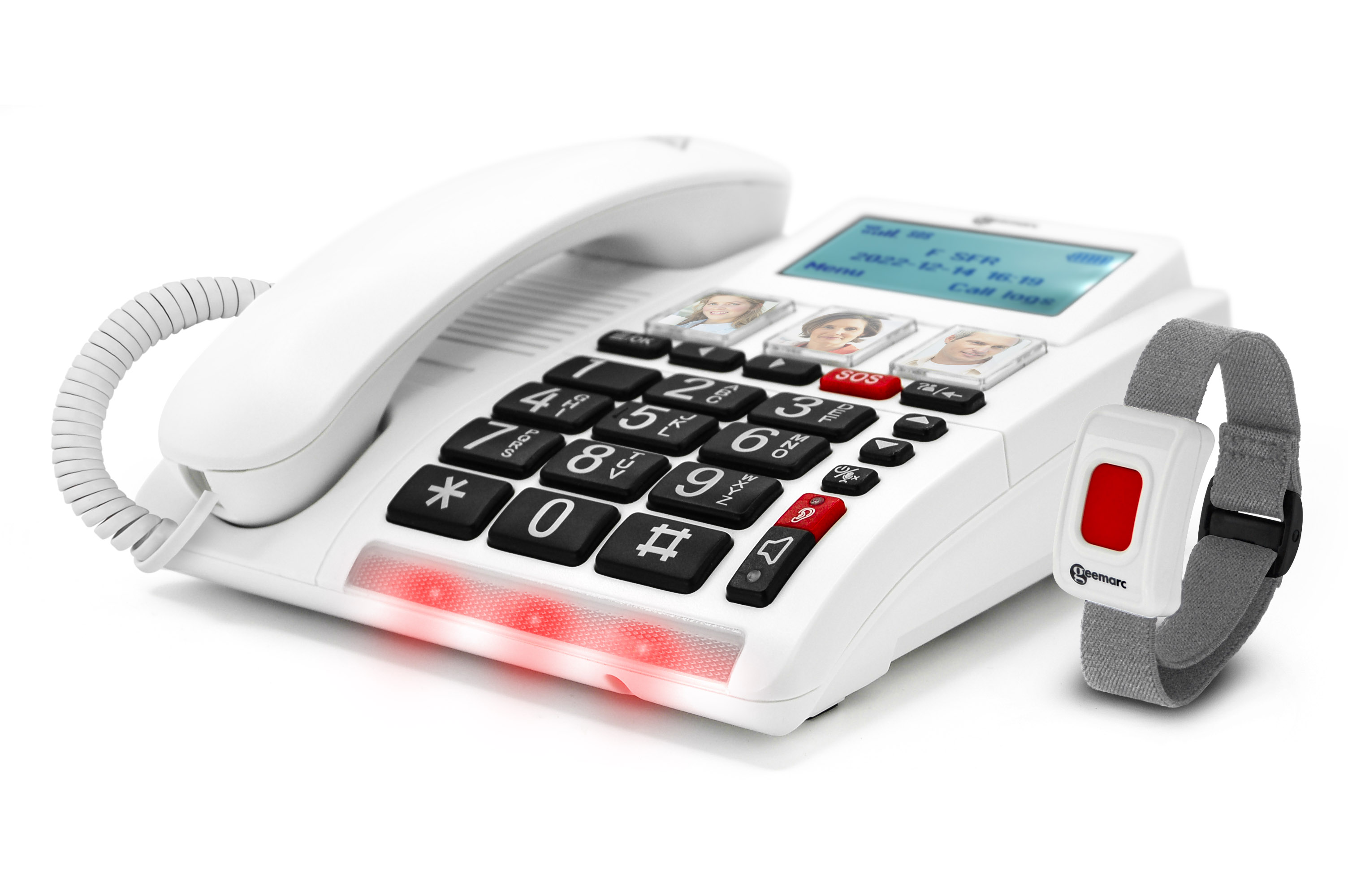 GSM bordtelefon til SIM-kort med ekstra høj lyd, store taster, fototaster og talende nummervisning. Leveres med SOS-armbånd til nødkald til pårørende. Velegnet til ældre og brugere med nedsat hørelse, syn eller hukommelse, hvor en fast telefonplads giver tryghed i hverdagen.