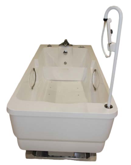 Sidepaneler i forstærket glasfiber, Forstærkede slanger t/vandinstallation, Håndbruser m/lang slange, Overløbssikring og pop-up afløb inkl. afløbsslange, To brede ben i rustfrit stål m/justérbare fødder, Aftagelig fodstøtte, justérbar i tre positioner. Kan udstyres med sansestimulerende funktioner. Kan integreres med Badelift-system - HMI 143015.