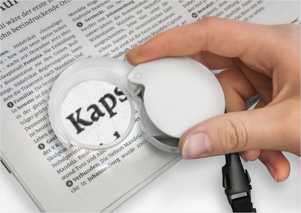 Folding pocket magnifier with a hard, protective case. Available with 4, 7 and 10 times magnification (white), in 35mm aspheric lenses. Its small exterior fits into almost any pocket, or carry it using the supplied carrying strap.