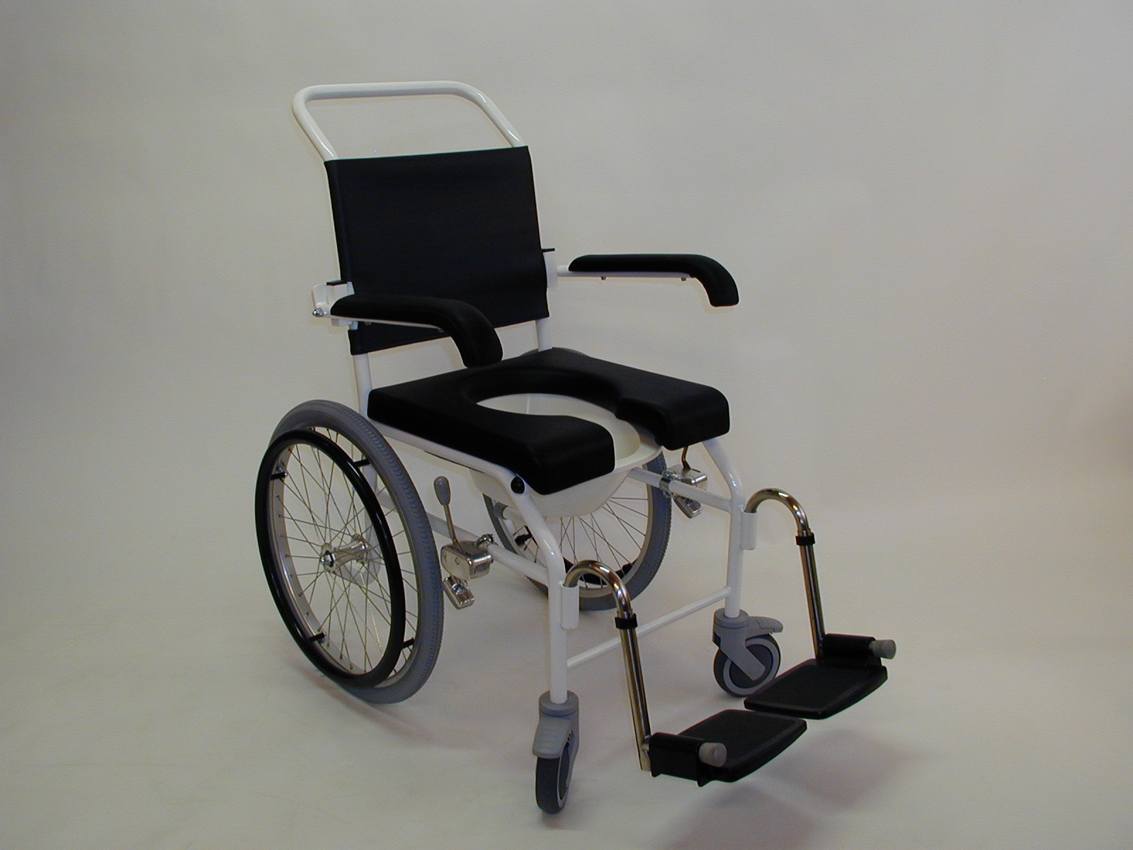 The BUZZ chairs have two 20 (or 24) pneumatic rear wheels and two 125 mm brake castors to facilitate toiletting over toilet bowls. Tip-up arm rests with PUR cushions. Also available with curved PUR-cushions. The wheels are equipped with brakes which are activated with a minimum of strength. Three available models: BUZZ 1, 2, and 5.