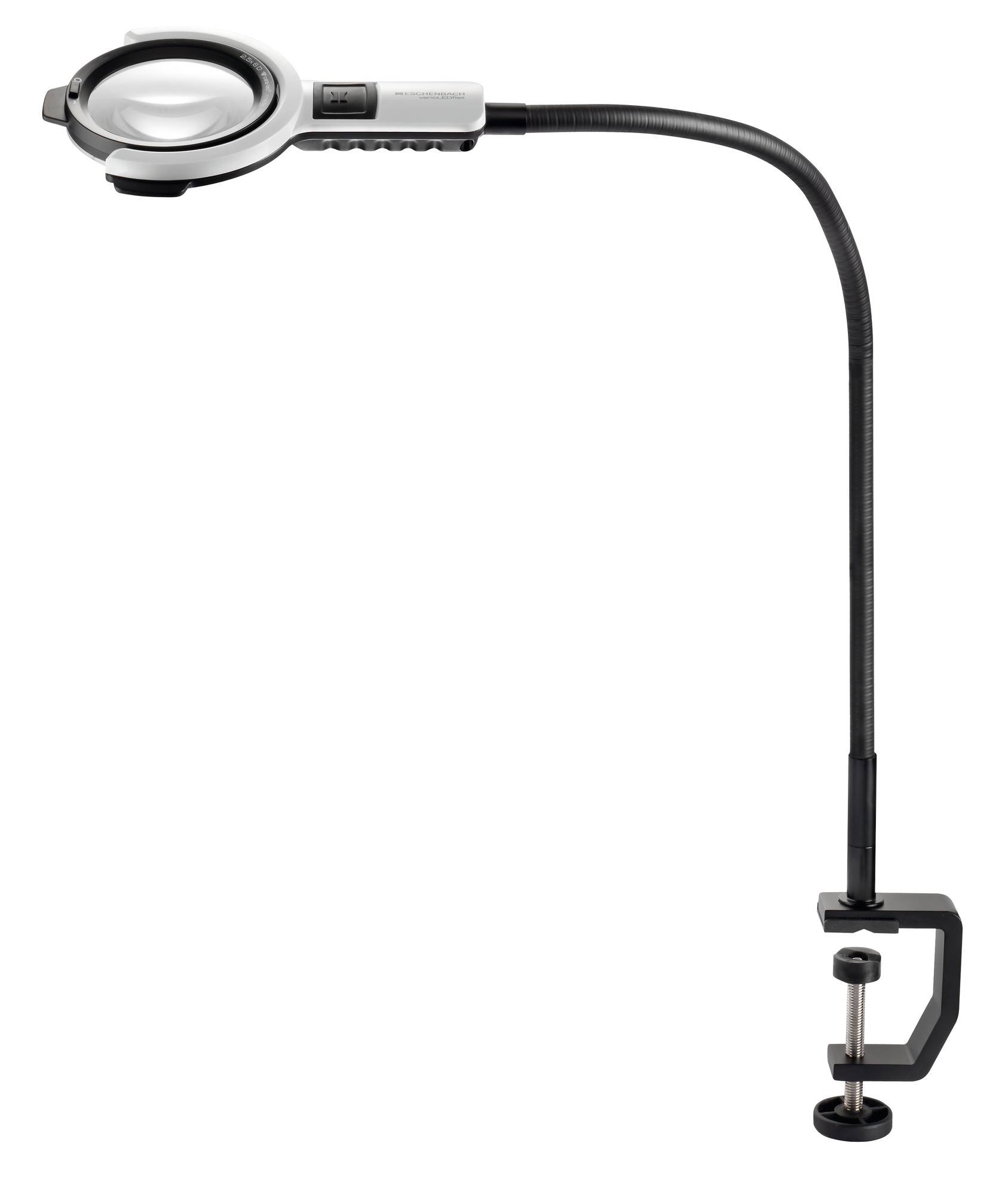 76mm diameter / 6dpt / 2,5x magnification. Switch between segment and full ring illumination. Near point 3,5cm. Illumination approx. 6000lx at a working distance of 150mm. Secured with table clamp. Kabel 3m. Supplied with power adapter