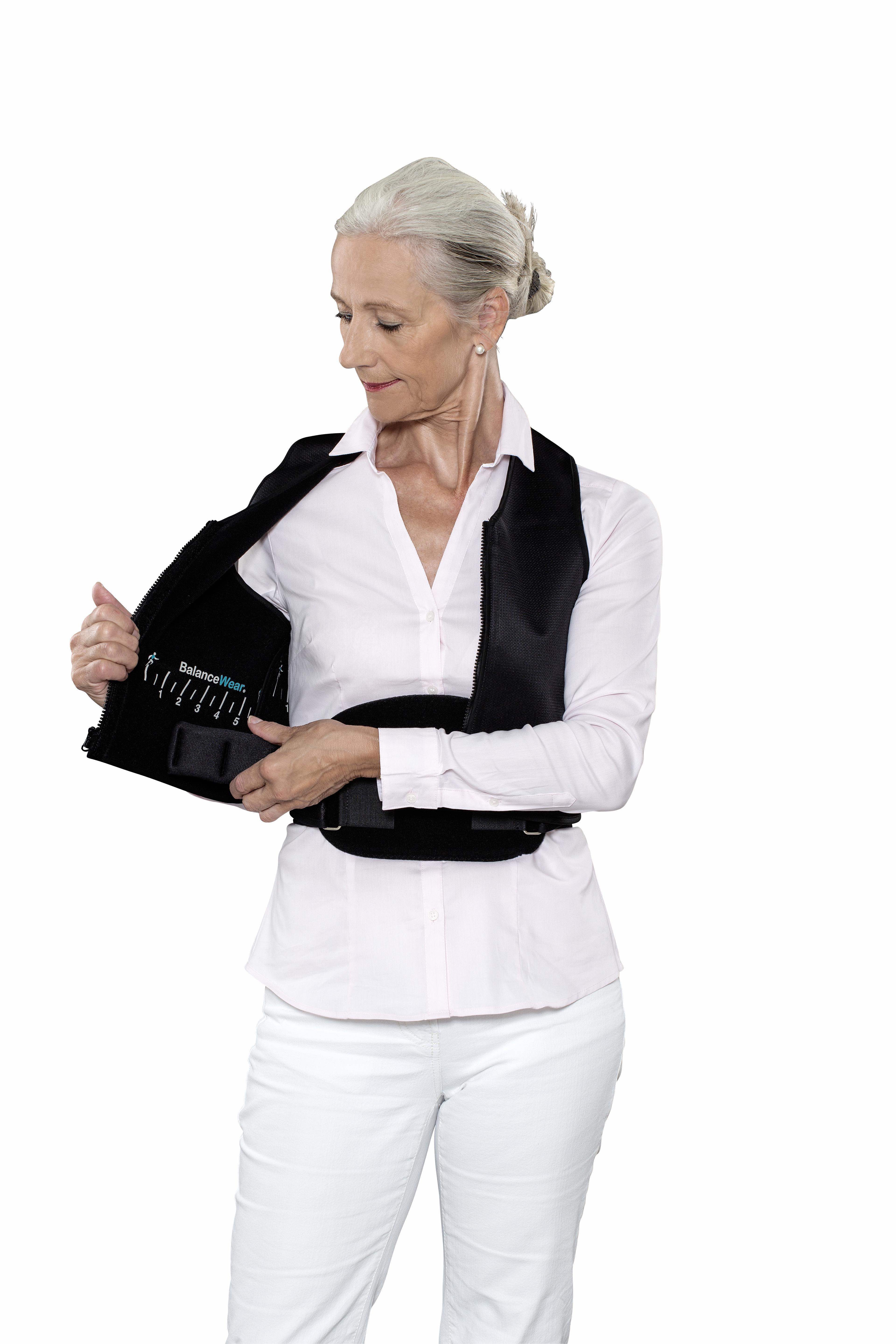 The BalanceWear vest, utilizing a discrete weight system, delivers sensoric information to the nervous system, and thereby effects the ability to maintain balance. Flexible weights are fitted to the vest, with a velcro system. The Vest is light and there are two versions one with a lumbar support and one without.