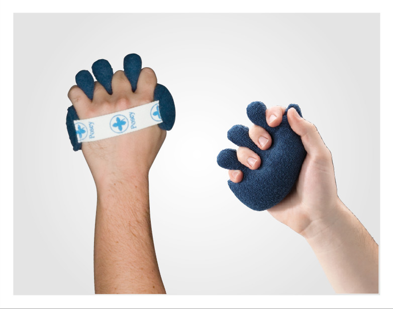 Custion for preventing contracture with finger separator. terry cloth. Easy to install. Elastic band over the back of the hand. Machine washable. Latex free. 13 x 8 cm.
