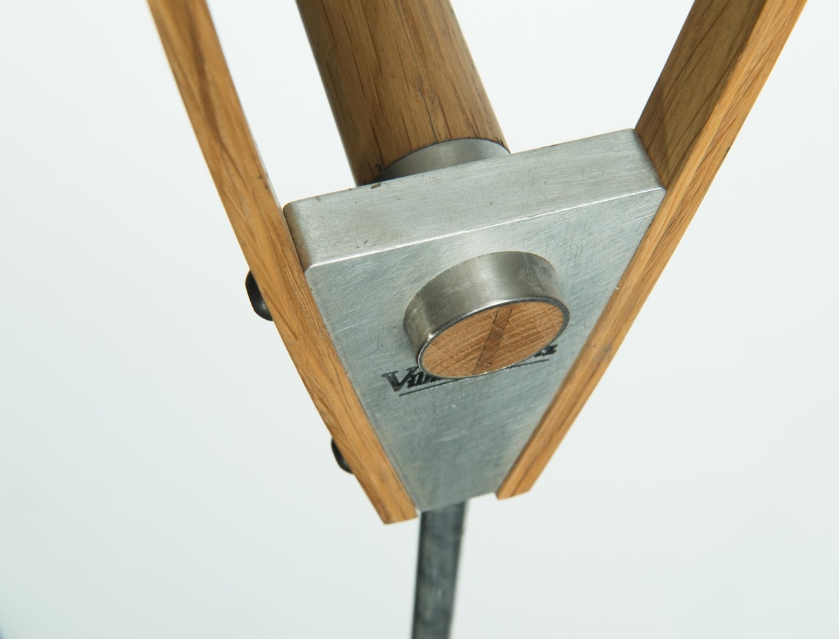 Rod is made from either airplane grade aluminum or carbonfiber which has the particular quality of being elastic. The handle fitting is CNC milled aluminum. Molded oak strips for leather arm support. Handle is hand-turned oak. Treat wood with linseed oil and leather with neats-foot oil.