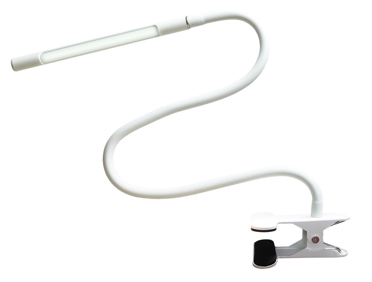 Lamp on spring-loaded clamp with flexible gooseneck-style arm, providing cool 5500K LED lighting, driven by power from a USB connection. Simple operation with on/off and dimming integrated in a single, touch-sensitive button on the lamp head. Available in Black and White