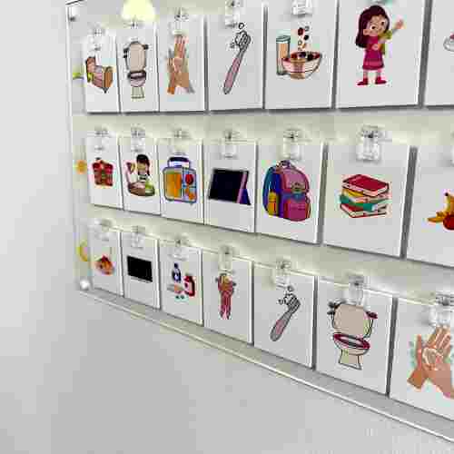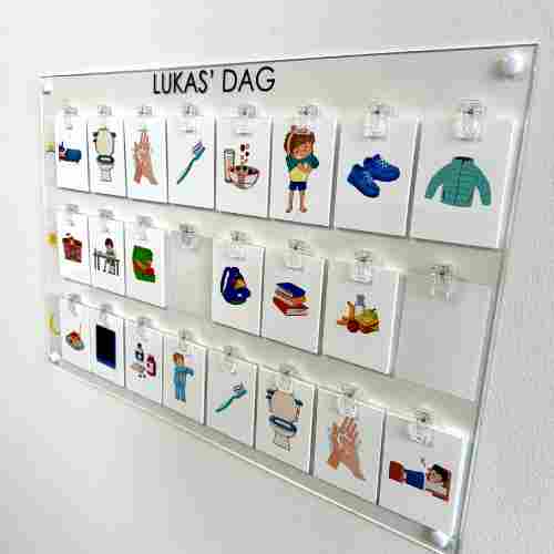 Pictograms with associated pictogram plate in acrylic. The pictograms are durable and available in different sizes. 24.5 cm x 33 cm and 40 x 60 cm respectively. The large plate is suitable as a permanent fixture in the home, while the small plate is suitable for taking on trips. It is possible to choose a travel bag for the small model.