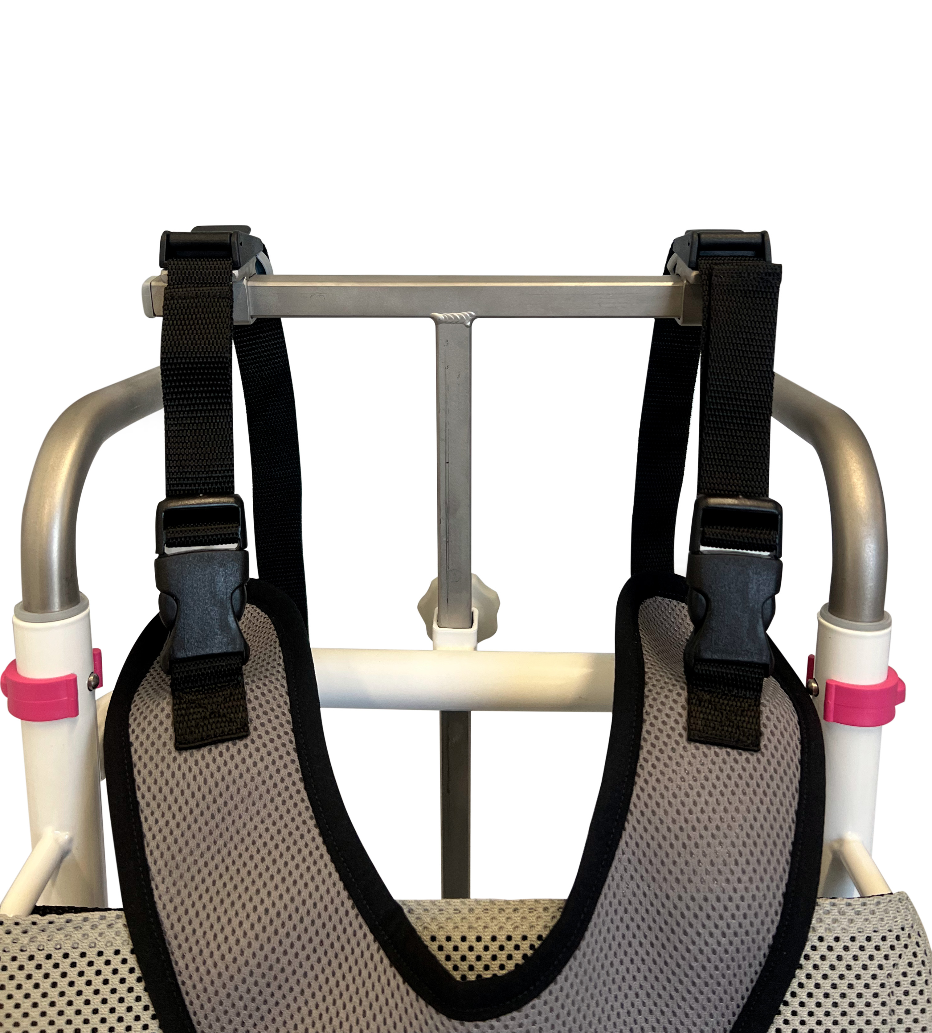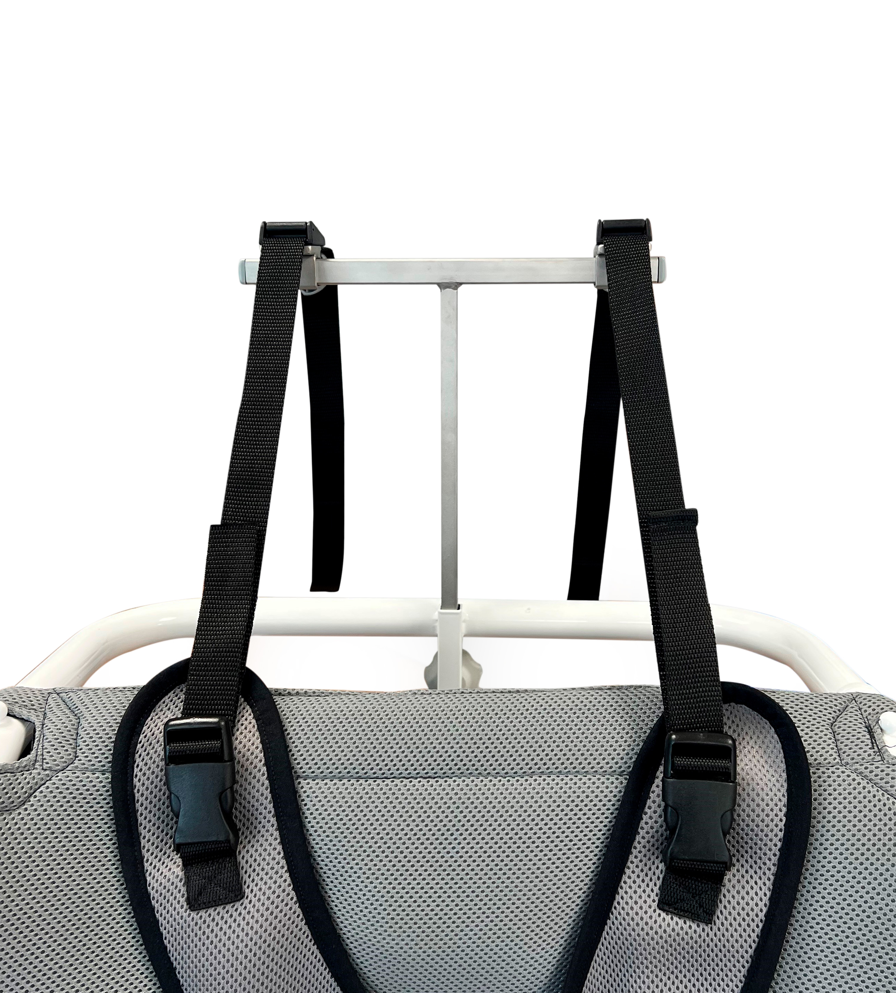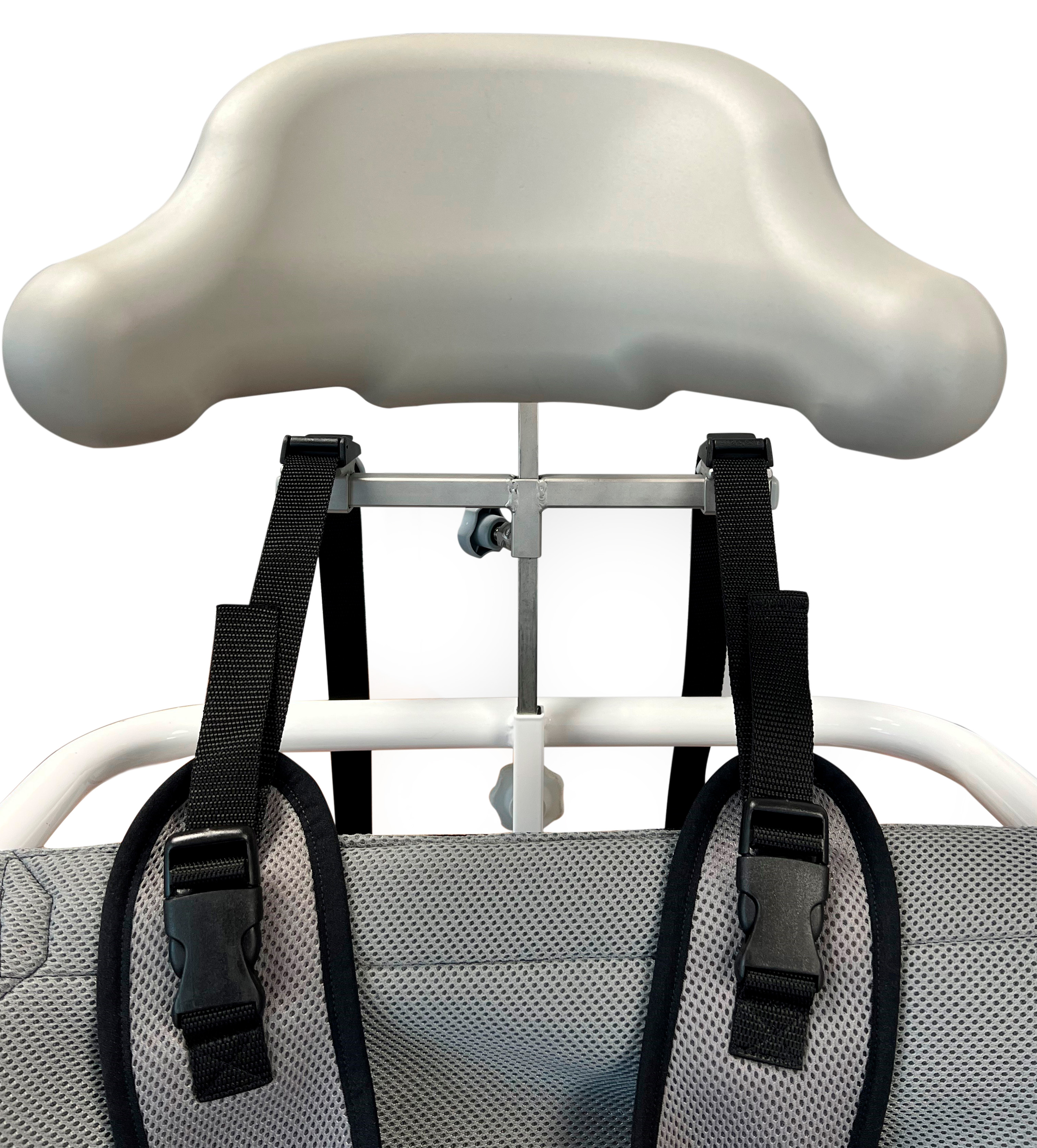 The four brackets for the Sternum vest allow mounting on small and large headrest holders with or without a headrest. The brackets are adjustable in height and width. The upper straps attach via quick-release buckles, ensuring stable and secure positioning of the vest.