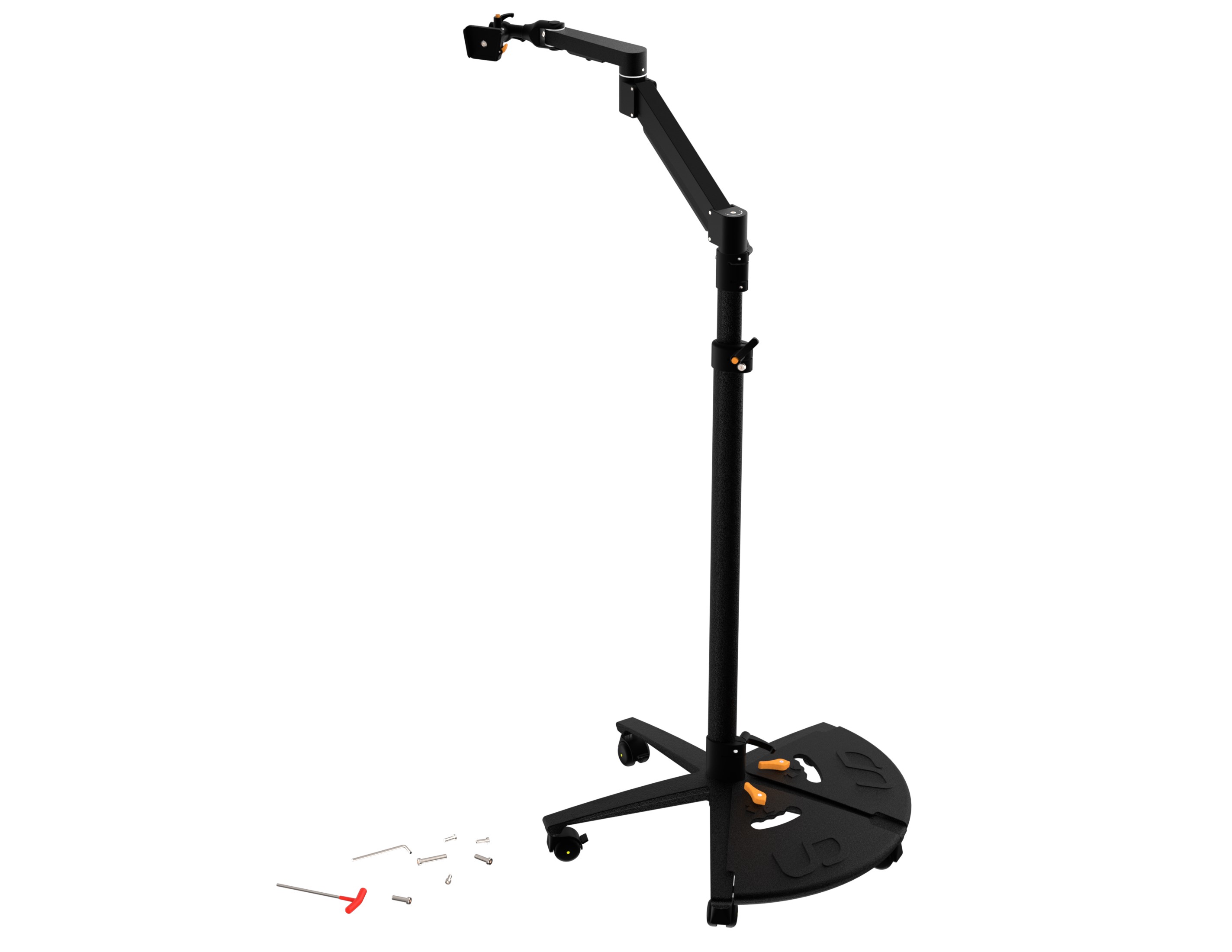 The floor stand can accommodate devices weighing from 0.7 to 4 kg. It features a five-wheel base that ensures high mobility and stability. The mounting height is easily adjusted.