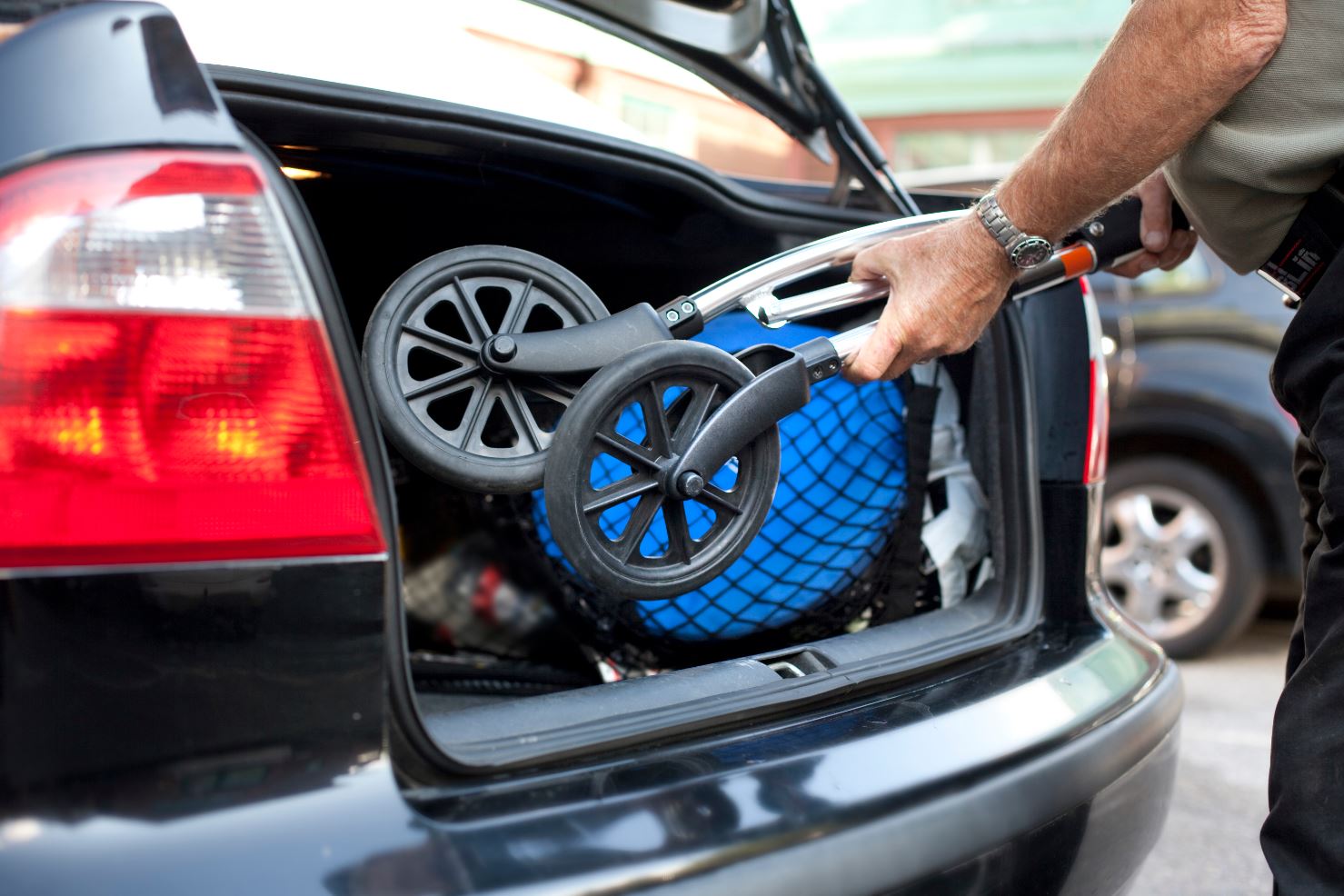 Foldable, adjustable in 7 heights (7690 cm) and with a reflector in the handle.