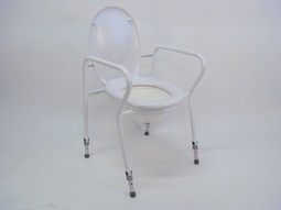 Height adjustable toilet aid with a design to facilitate toiletting and maintenance. Framework of stainless steel. The arm rests may be furnished with PUR cushions at request.Extension legs of aluminium at request shorter or longer legs. Toilet seat with lid. Pot or splash guard included.