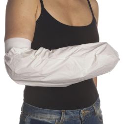 Full arm shower protector offers effective water resistance. Covers from hand to upper arm, keeping casts, bandages, or wounds dry while showering. Elastic opening ensures a snug fit. Easy to put on, reusable, and intended for shower use only. Not suitable for swimming or bathtubs.
