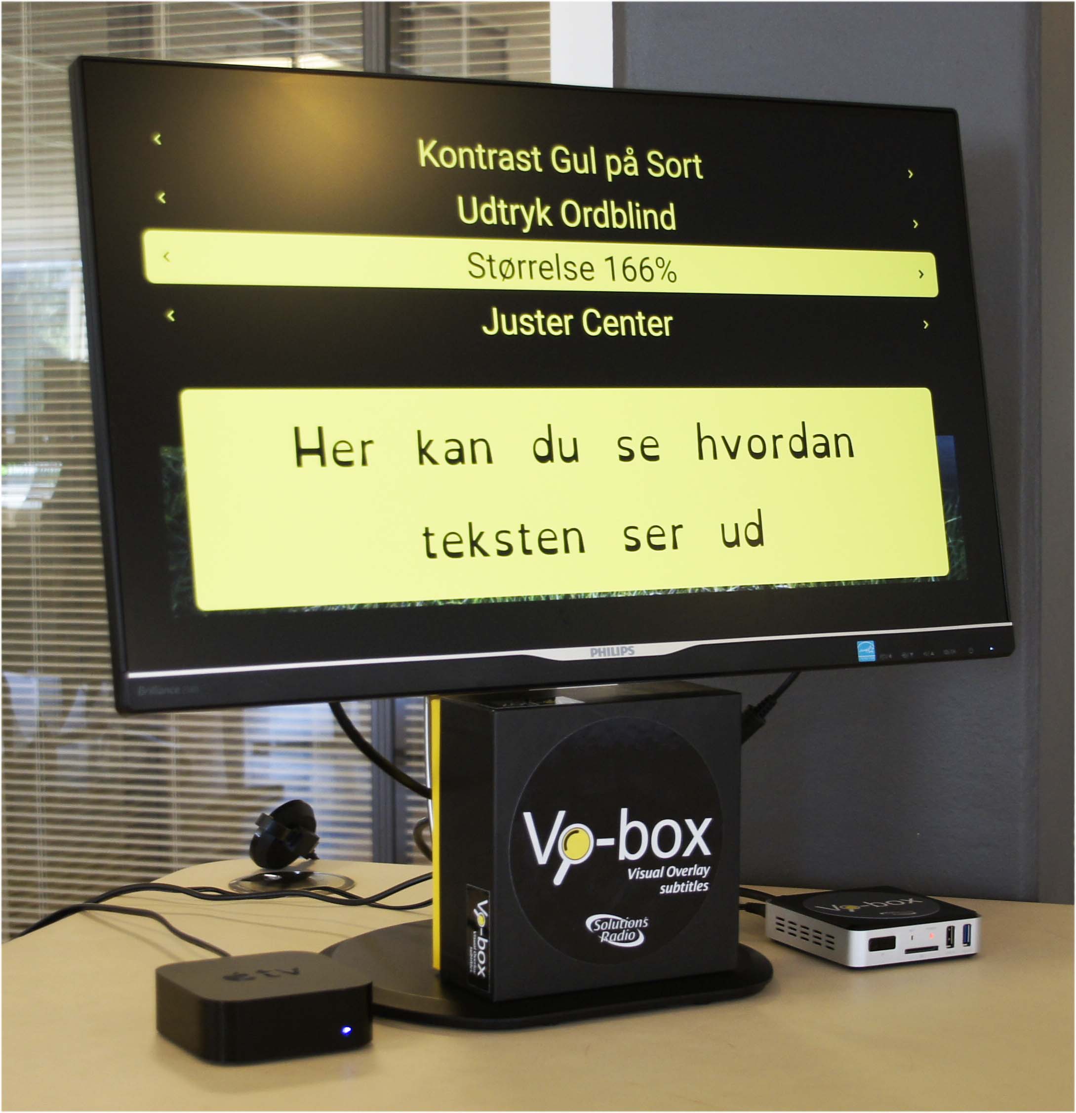 Vo-box er en diskret og enkel enhed. TV boks tilsluttes HDMI-porten i Vo-box, og fra Vo-box tilsluttes TV via HDMI-kabel. Medfølgende fjernbetjening er enkel med kun få knapper. Du kan vælge mellem fire forskellige kontrastindstillinger, samt syv forskellige skrifttyper. En speciel skrifttype er specielt velegnet til personer med ordblindhed.