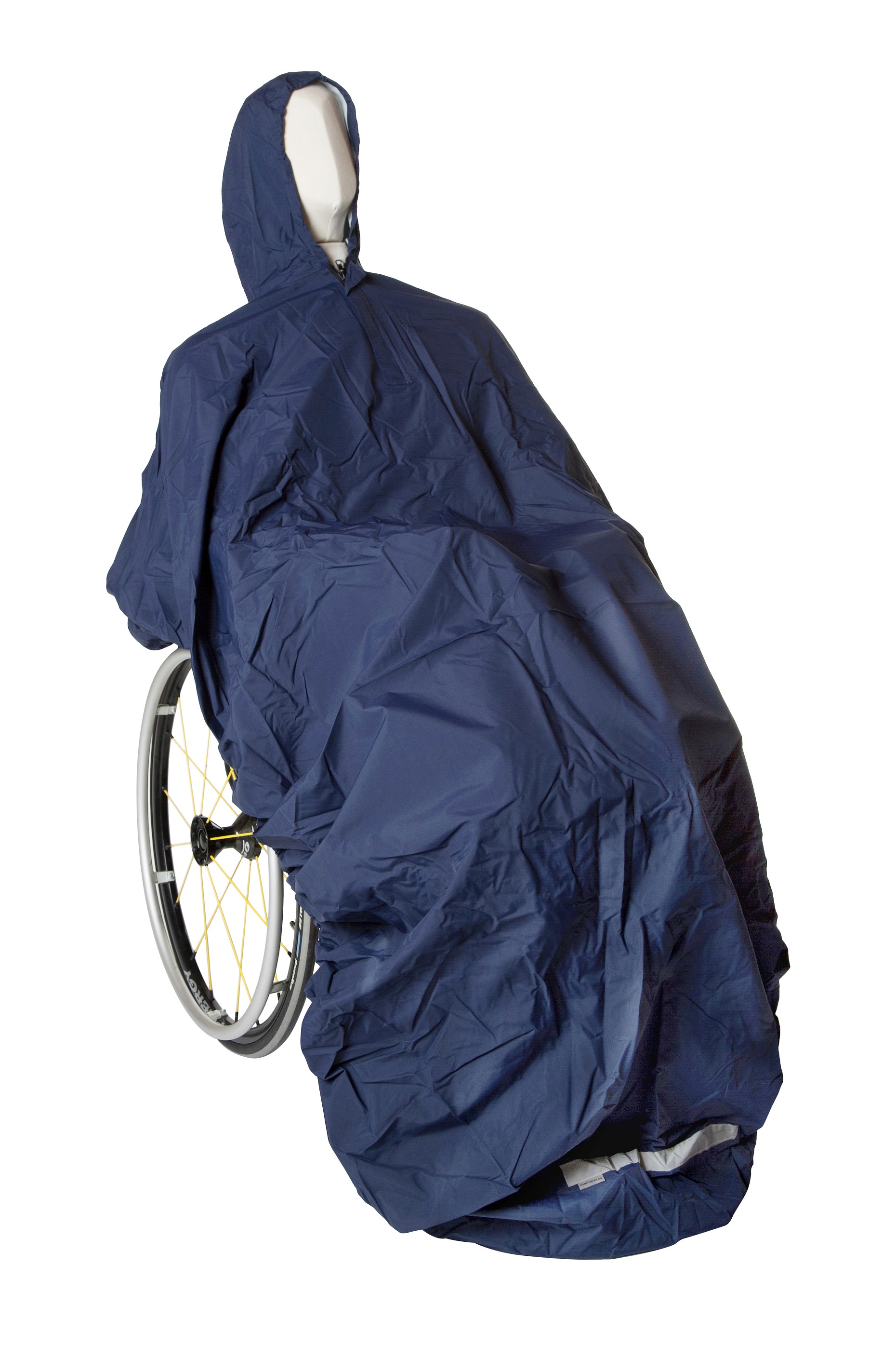 Regnslager dækker helt brugeren og kørestolen, den er uden ærmer og derfor velegnet når brugeren skubbes af en hjælper. Regnslagene leveres i farven blå. I fuld åndbart materiale, der ikke danner kondens på indersiden.