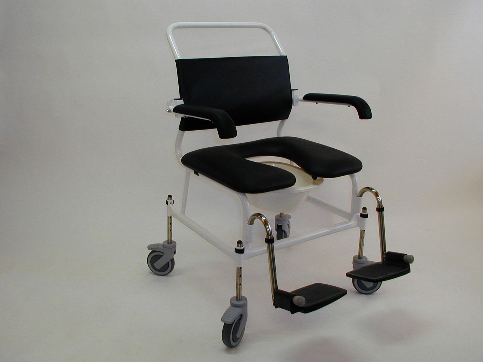 Toilet-/badestol til store brugere. Med justerbar stropryg, polstret sæde med oval åbning og opklappelige PUR-armlæn. Justerbar sædehøjde ned til 42 cm ved 80 mm hjul. Leveres som standard med 125 mm bremsehjul.