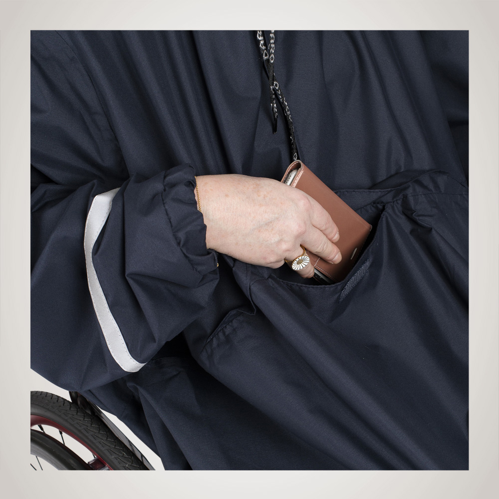 Regnslaget er faconsyet og har hætte med snøre. Øverst foran er der et lille underfald, så slaget kan udvides lidt, således at det er nemmere at få på. Der er desuden en lomme foran, som lukkes med gribebånd, og ærmerne har elastik ved håndleddene. Langs kanten af regnslaget er der indsyet elastik, så det sidder tæt ind til brugeren.