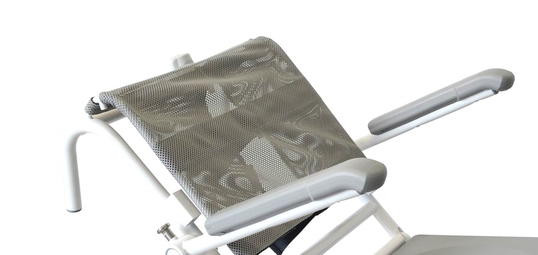 Bade/toiletstol hvor både sædevinkel (tip) og rygvinkel kan justeres via fjernbetjening.