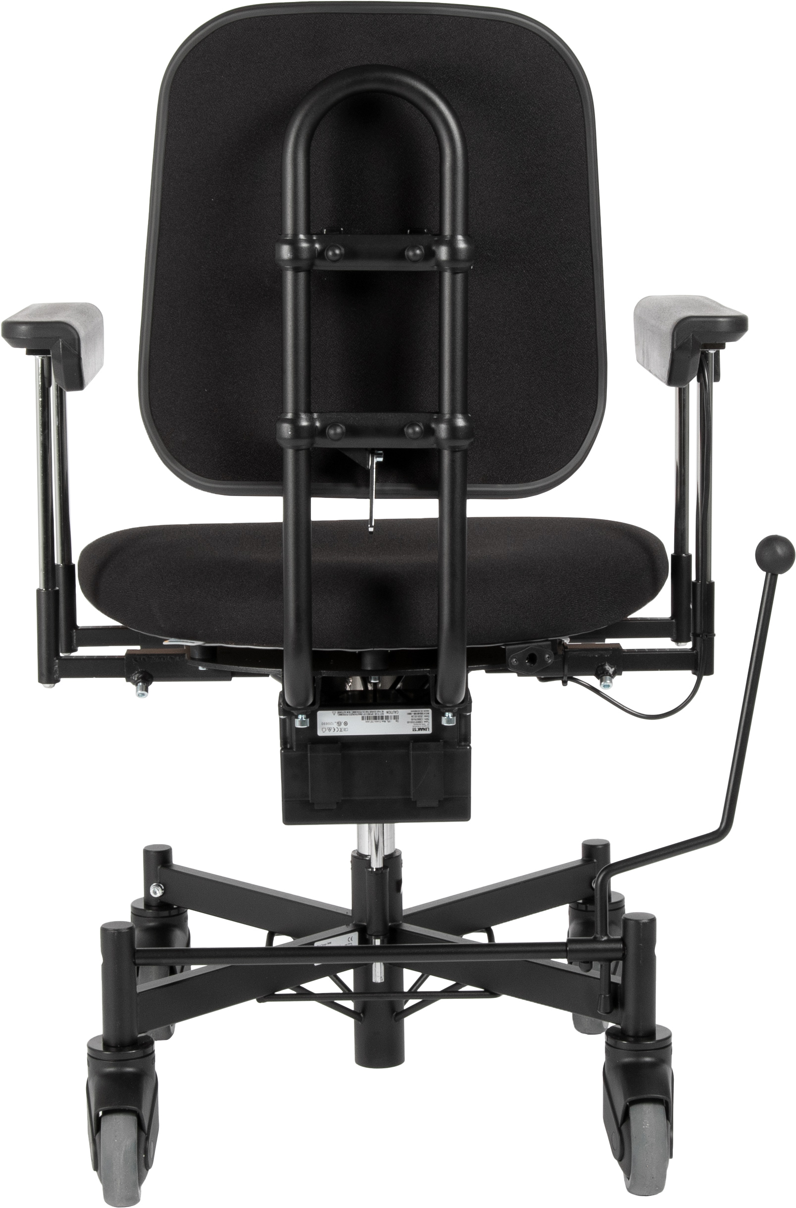 Centralbremsen kan leveres enten højre- eller venstrebetjent. Stolen kan laves efter mål, såvel sæde som ryg. Siddehøjde: 42-57 cm eller 49-69 cm. Stort tilbehørsprogram, forskellige sæder og rygge, højde- og breddeindstillelige armlæn etc. Leveres komplet med lader og batterier.