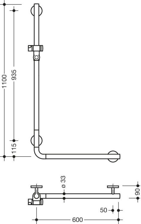 Brusestang og støttegreb samlet i L-form. Lodret 1100 mm, vandret 600 mm, dybde 90 mm. Ø33 mm greb og Ø70 mm roset. Justerbar bruseholder med konisk adapter. Vægmonteret. Egnet til hængesæder. Polyamid med korrosbestandig stålkerne.