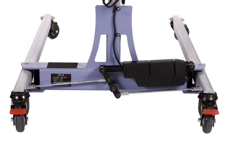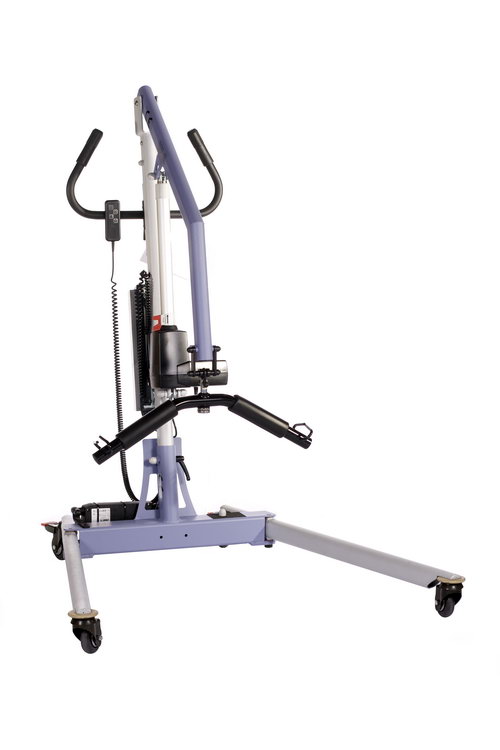V-lift med svingende ben og polstret løfteåg som standard. Højderegulerbart håndtag og jævn bevægelse ved benspredning.