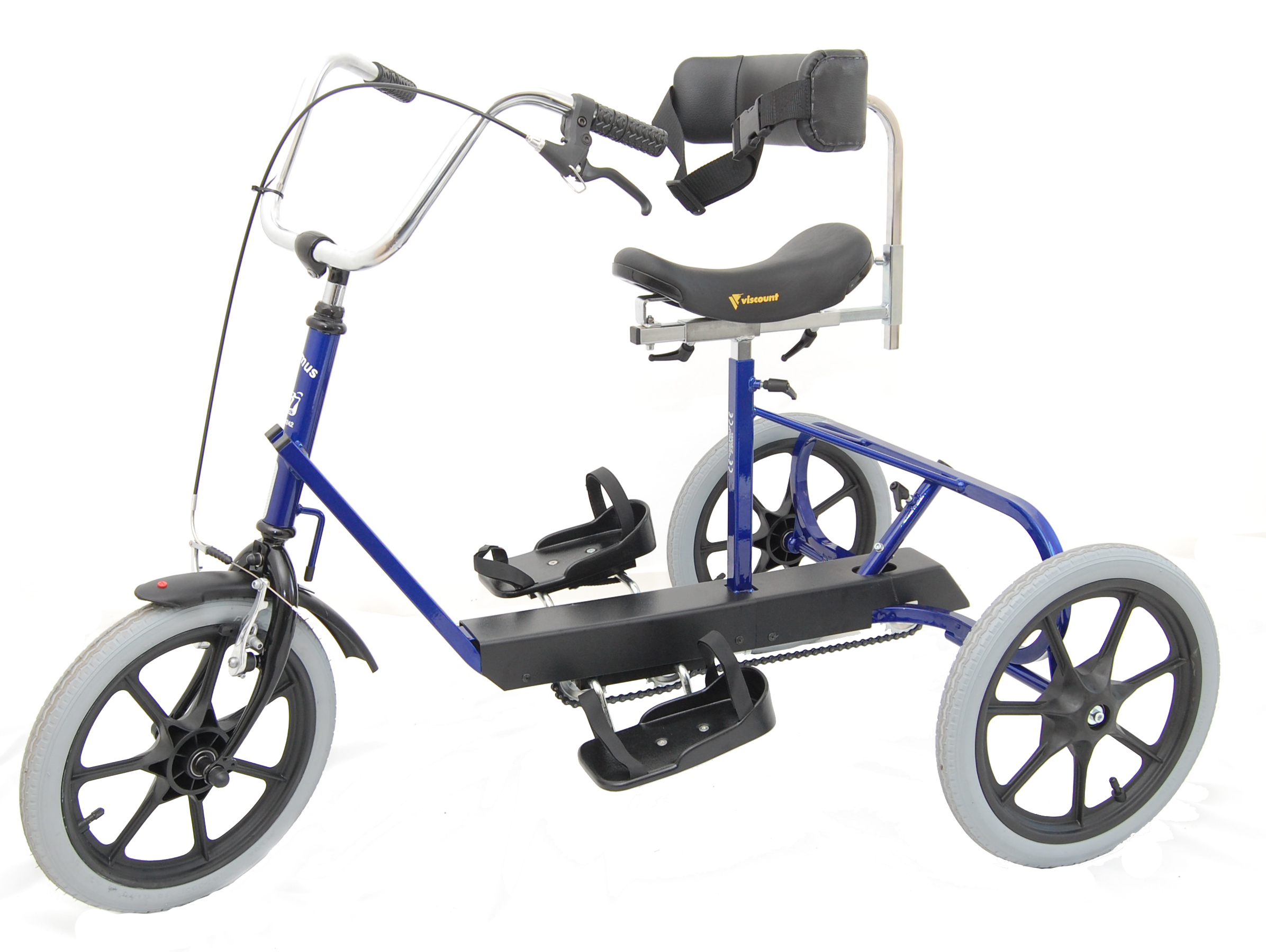 Dobbelt krank, geares efter ønske. Kan leveres med 3 gear, hvis fast nav fravælges. Håndbetjent trommelbremse med parkeringsbremse på forhjul. Fingerskruer til hurtigt indstilling af cyklen. Der findes et stort tilbehørsprogram Cyklen kan leveres med fodbremse. Farve: kongeblå.