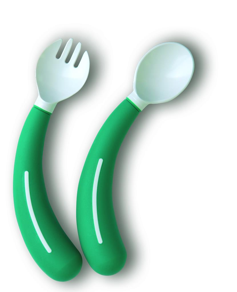 Juniorske eller gaffel. Grebet er ergonomisk formet og let buet. Der findes ske og gaffel til henholdsvis højre og venstre hånd. Bestikket tåler opvaskemaskine. Det er udviklet i samarbejde med ergonomer.
