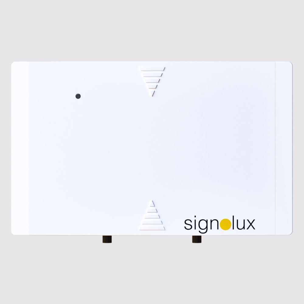Signolux Babyalarm er i en lille pæn firkantet og diskret design. Mikrofonen placeres så tøt på baby som muligt og senderenheden kan stilles et sted i nærheden. Den kan også monteres på væg med medfølgende vægbeslag. Ved tvivl om, hvorvidt senderen er aktiv, er der batteritestknap, der ved aktivitet sender signal til seriens pågældende modtagere.