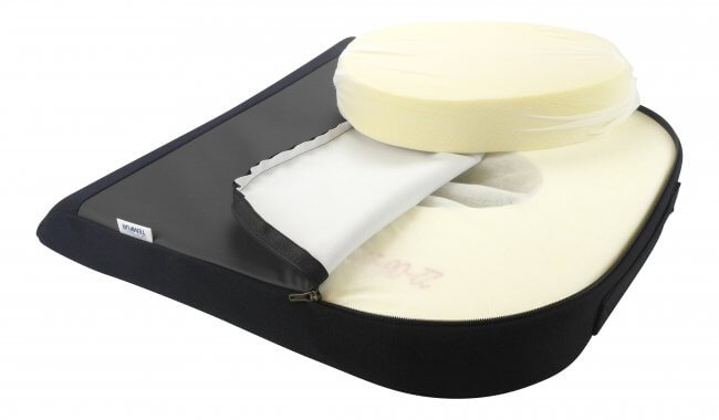 - I midten har puden et område i blødere skum, som aflaster halebenet