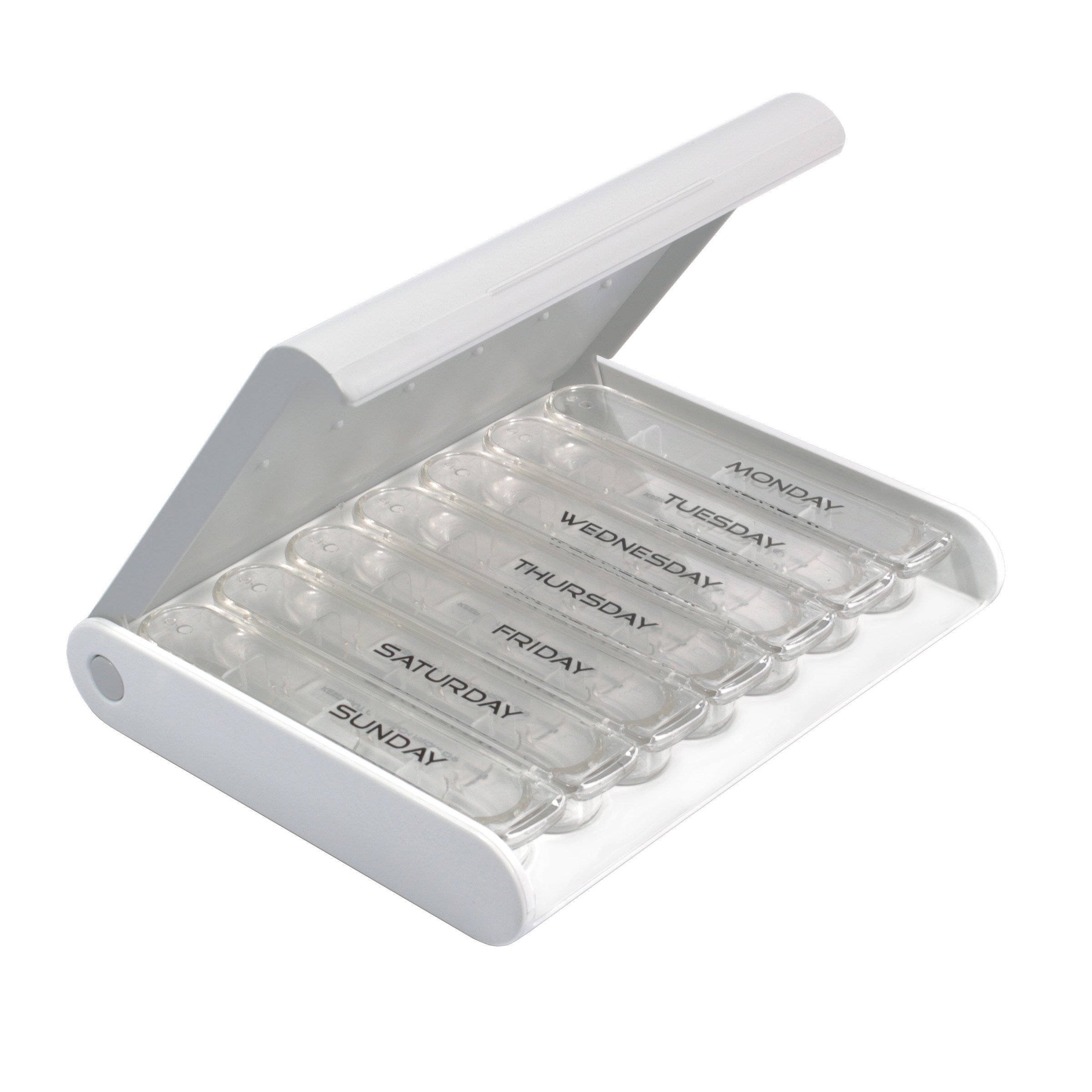 Med åbent låg på pilleæsken kan alle doseringsæsker og rum ses. Dermed kan det umiddelbart tjekkes at piller er taget som planlagt.