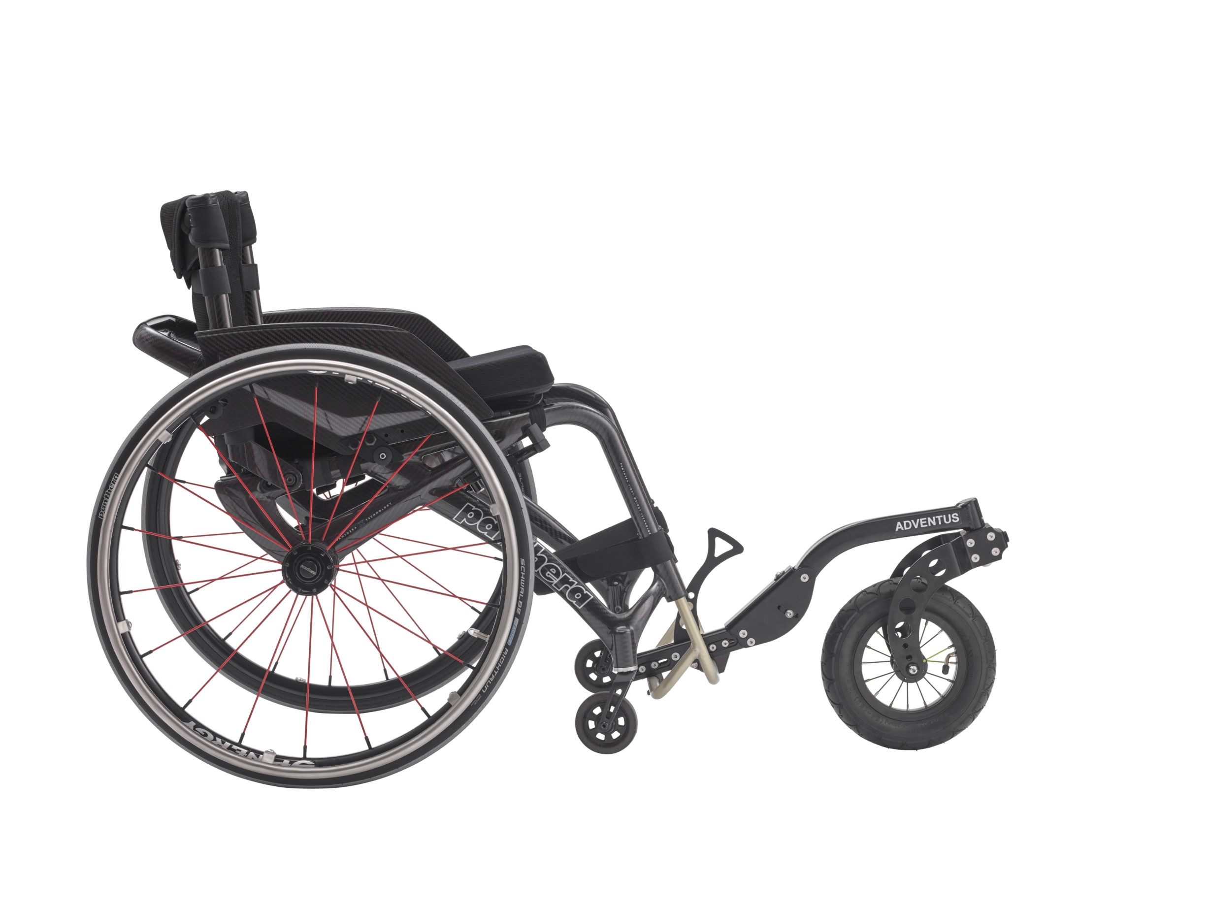 10" forhjul der klikker på kørestolens fodstøtte. Gør stolen lettere at manøvrere på ujævnt underlag. Vægt: 2,45 kg. Højde: ca. 35 cm. Længde: ca. 45 cm.