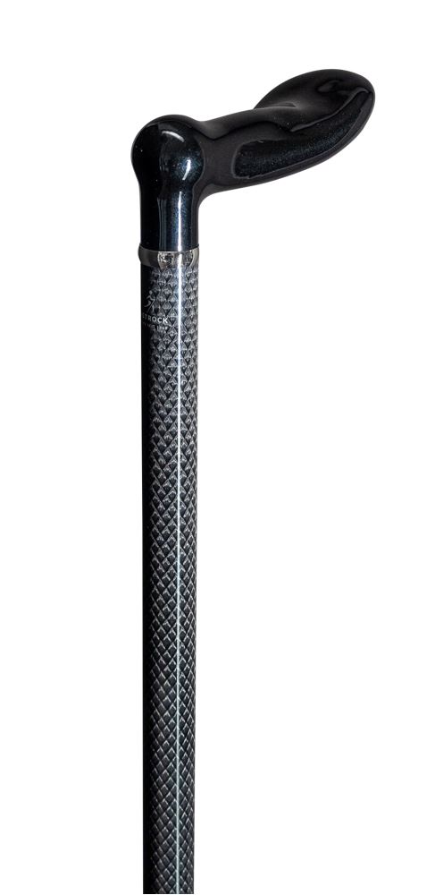 Solid, højdejusterbar kulfiberstok med et nyudviklet, ergonomisk håndtag, hvor stokken kan bruges i både venstre og højre hånd. Bagerst er håndtaget bredt, så vægtbelastningen fordeles godt i håndfladen og ved håndroden. Skaftet har gråt/sort mønster og er højglanspoleret og med en solid gummidup i enden.