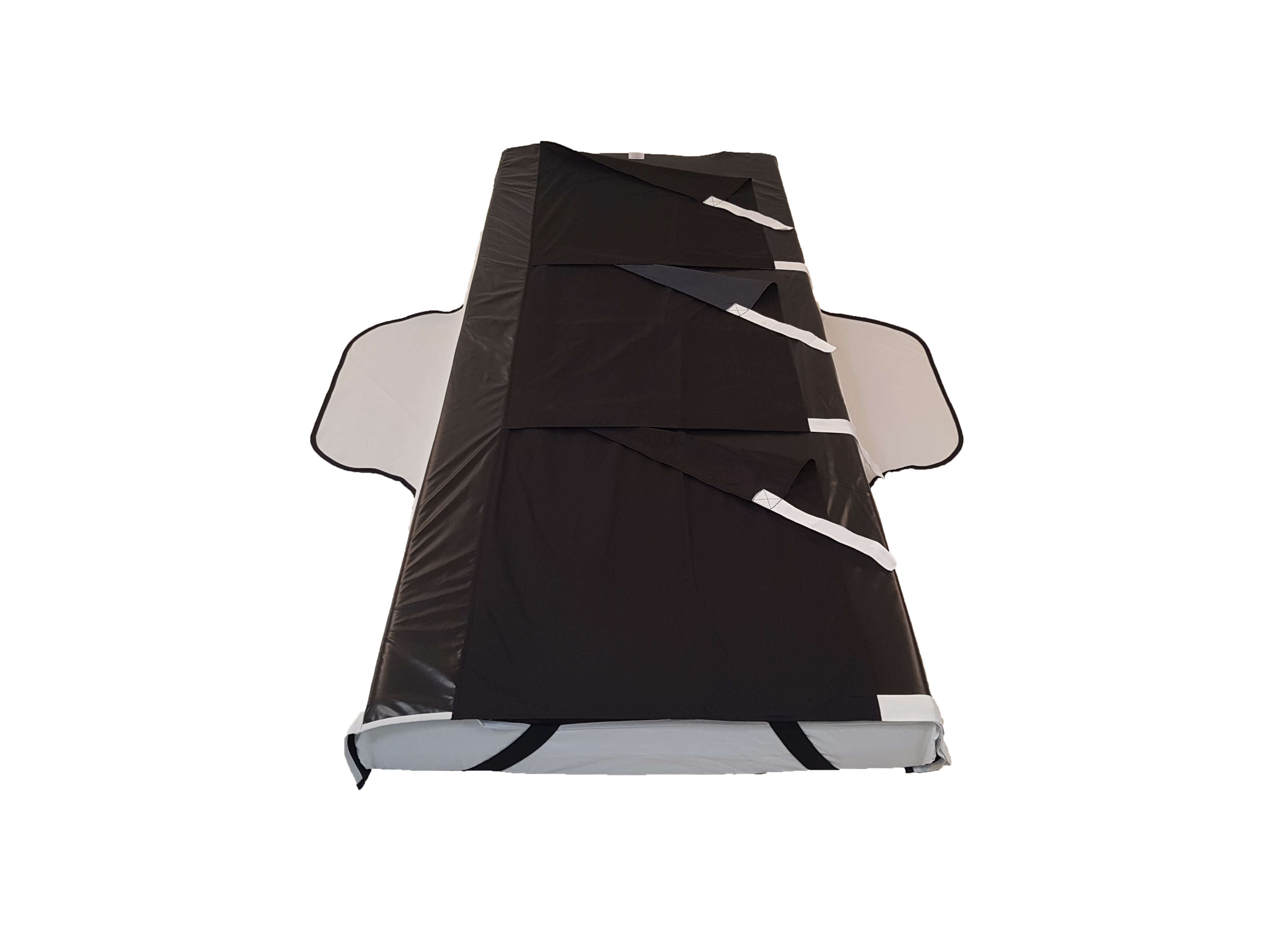 Re-coveret fikseres det rundt om hjørnerne med elastikker og på midten med vinger, som lægges under madrassen uden at løfte denne. Glidedel 60 cm Vask: max 60C.