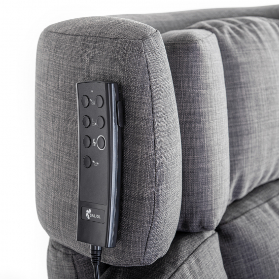Har lydsvag dobbeltmotor, der kombinerer ergonomisk siddekomfort med brugervenlighed og faldforebyggelse. Stolen gør det nemt og sikkert at rejse og sætte sig. Har fjernbetjening til indstilling af vinkel m.m. samt hjul, som kan låses vha. klik-system.