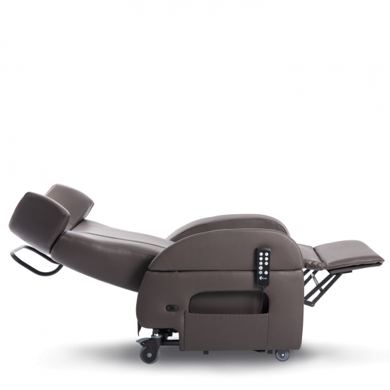Multifunktionel stol til løft, hvil og transport. Inkl. motor, fjernbetjening og låsbare hjul. Justérbar sædedybde: 51–56 cm. Fås i læder og tekstil.