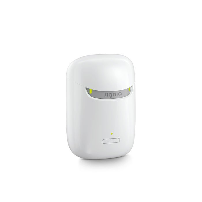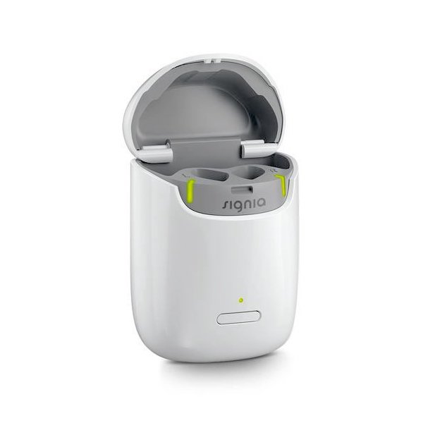 Signia Styletto X Charger er en trådløs oplader til Signia Styletto X høreapparater. Den oplader trådløst og fungerer som en powerbank til dine høreapparater. Selve opladeren kan også oplades trådløst med en trådløs ladebase.