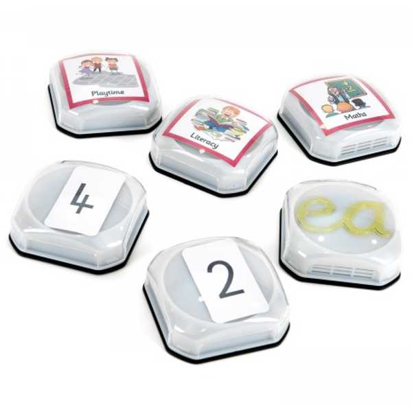 6 store enkeltstående kontakter, der har et gennemsigtigt plastikcover, der nemt kan klikkes af. De har plads til der indsættes et piktogram, tal, ord og lignende. Hver knap kan optage op til 60 sekunders lyd.