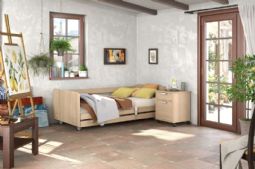Plejeseng med Lindberg egefinér og høje gavle. Ergoframe-teknologi giver 16 cm ekstra plads i bækkenområde. Inkl. madras og montering.